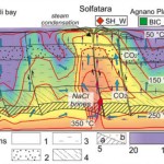 Il sollevamento del terreno, infatti, è attribuito all’aumento della pressione dei gas piuttosto che all’avvicinamento di magma alla superficie. Questo è confermato dall’andamento praticamente orizzontale dell’isoterma di base a 350 oC, rappresentata in rosso nella figura sottostante (la lava ha temperature di gran lunga maggiori, almeno doppie).