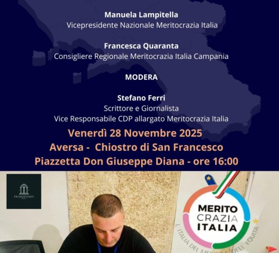 Ieri pomeriggio, venerdì 28 novembre 2025, si è tenuta ad Aversa (CE), presso il Chiostro di San Francesco, la tappa inaugurale del tour di presentazione del saggio del Presidente di Meritocrazia Italia Walter Mauriello “Il Merito della Democrazia”, che è anche il primo libro edito dal Movimento. Uscito da un mese e mezzo, è una silloge dei messaggi che ogni domenica il Presidente...