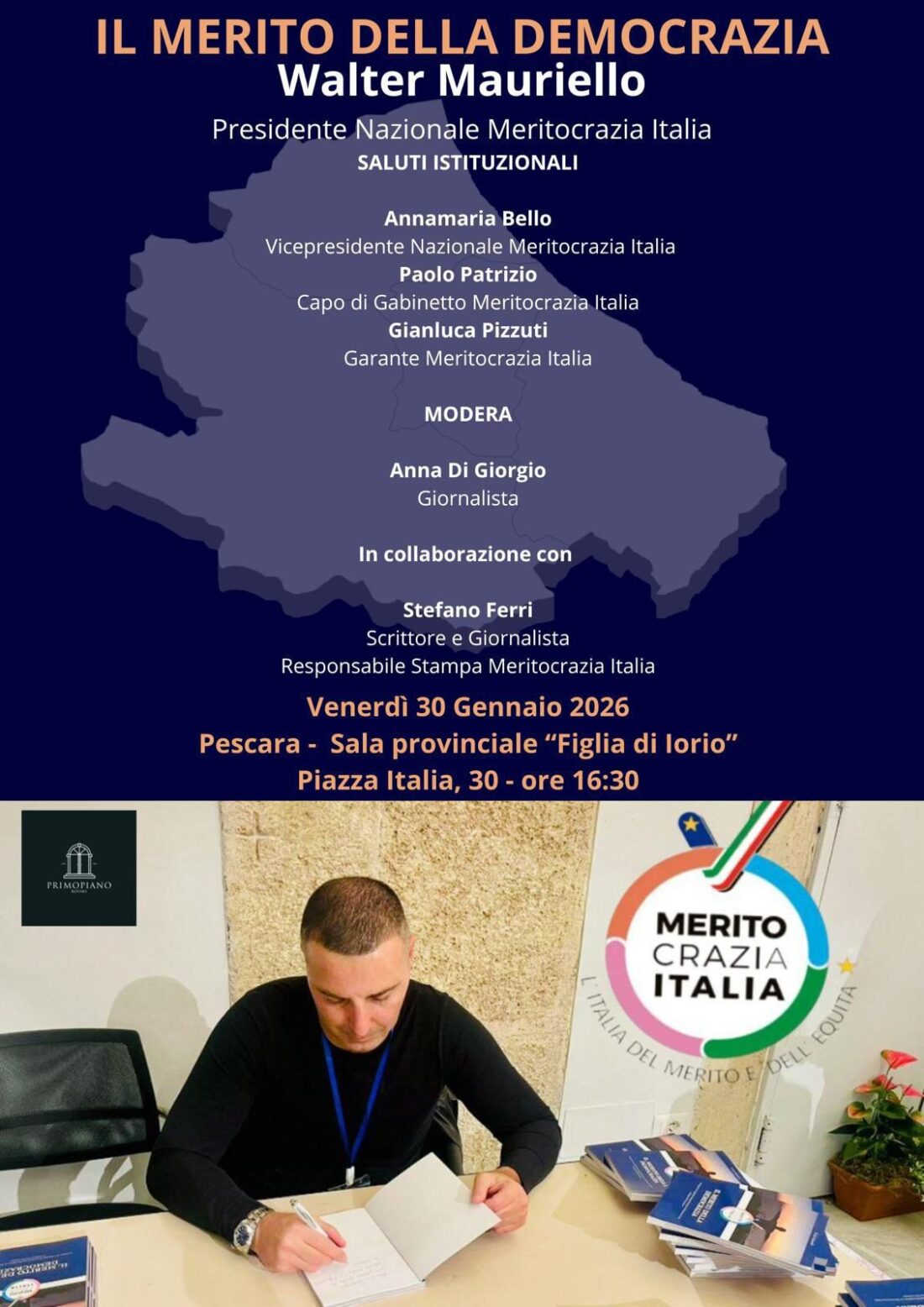 IL TOUR DI PRESENTAZIONE DEL LIBRO “IL MERITO DELLA DEMOCRAZIA” DI WALTER MAURIELLO, EDITO DA MERITOCRAZIA ITALIA, FA LA SECONDA TAPPA A PESCARA VENERDÌ 30 GENNAIO PRESSO LA SEDE DELLA PROVINCIA