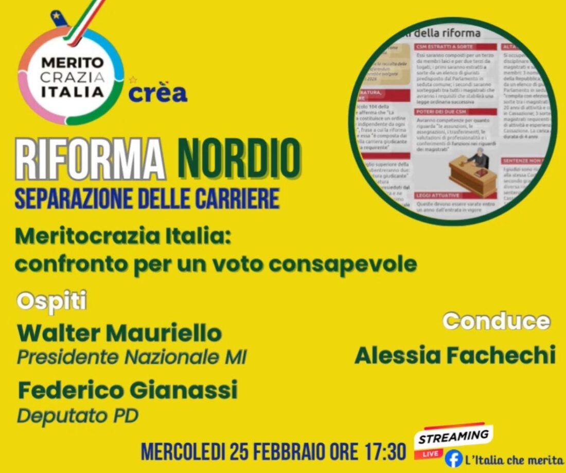 A meno di un mese dal referendum confermativo sulla riforma della magistratura, in programma domenica 22 e lunedì 23 marzo, i microfoni di Meritocrazia Italia si sono accesi per la quinta volta su questo tema, con una nuova diretta della trasmissione Riforma Nordio, condotta dalla Responsabile nazionale dei Ministeri di MI Alessia Fachechi.